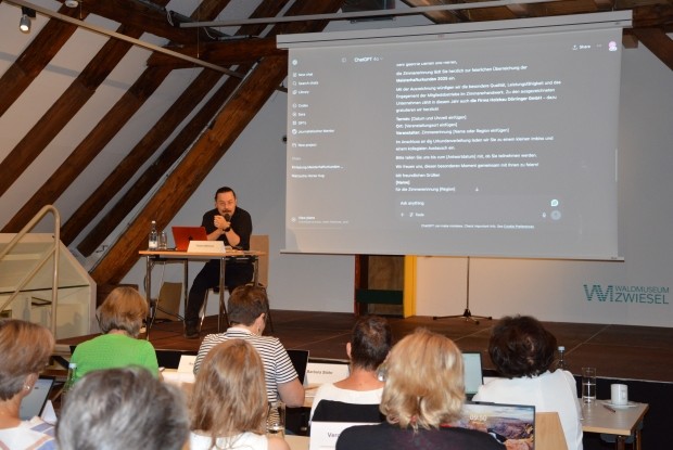 Der Referent Dr. Tristan Behrens zeigte die praktischen Einsatzmöglichkeiten von KI im Zimmererbetrieb und stellte verschiedene individuelle Anwendungsfälle vor, die schon heute erfolgreich genutzt werden, damit mehr Zeit für die eigentliche Arbeit im Betrieb, bleibt.